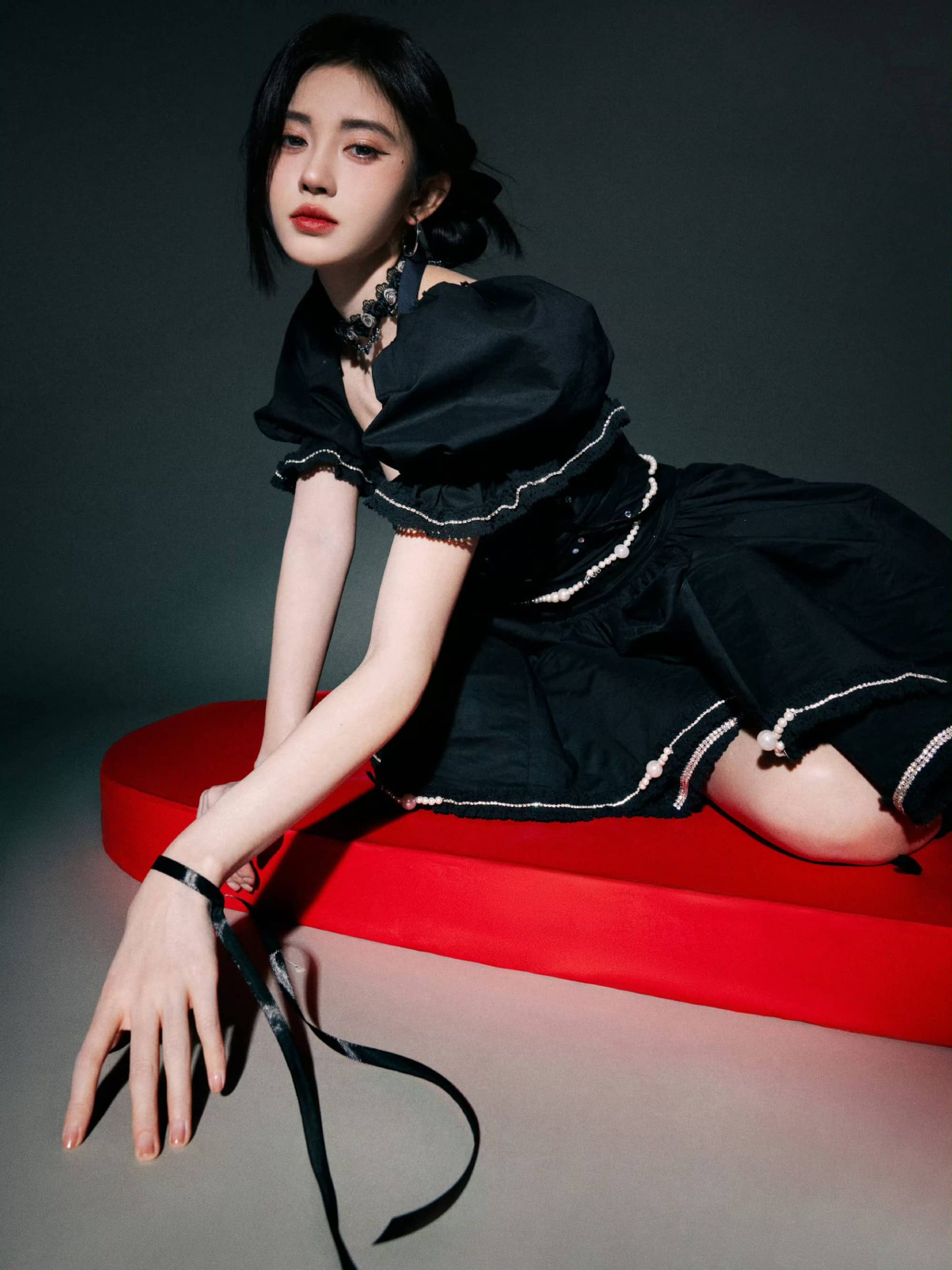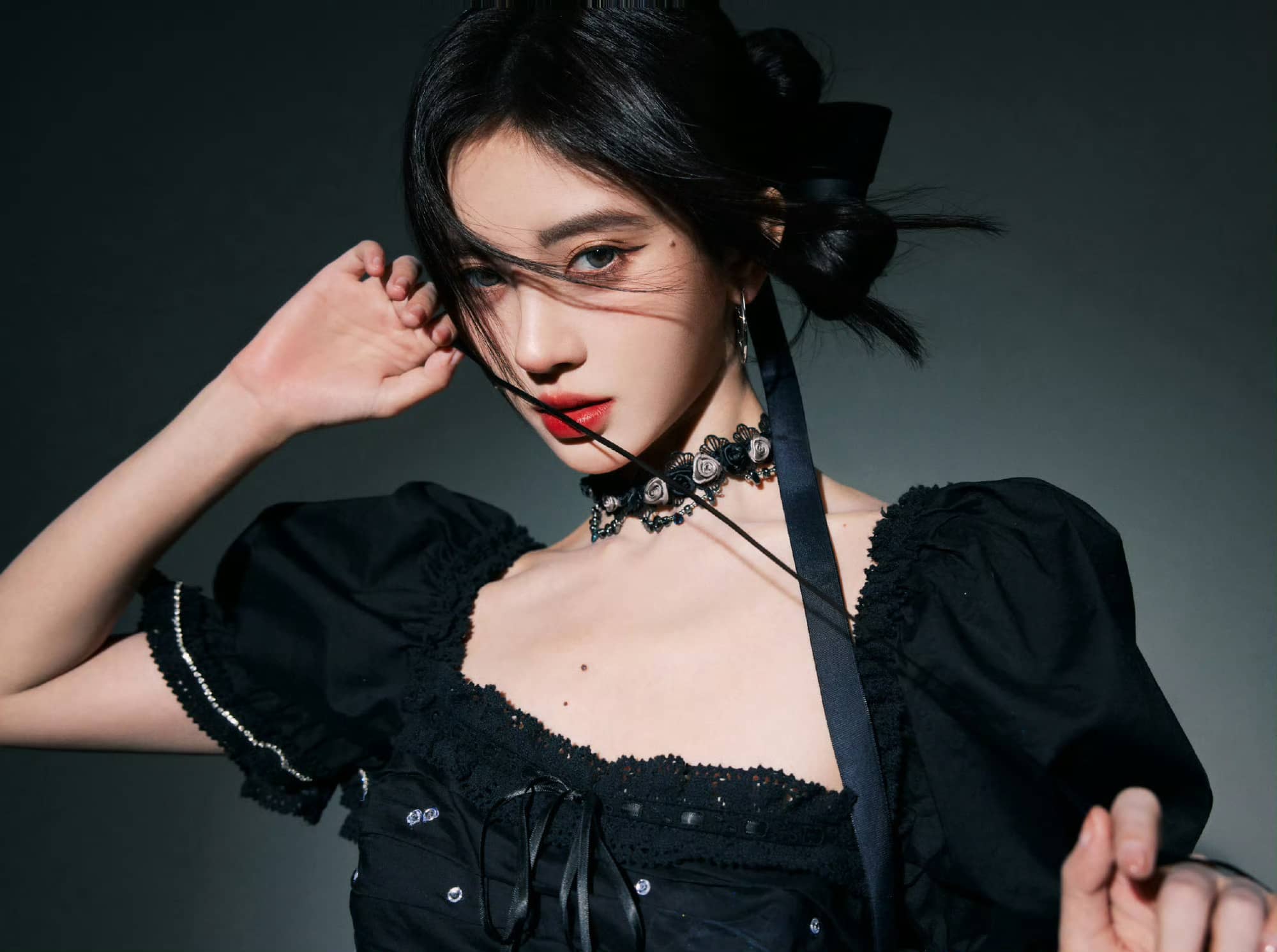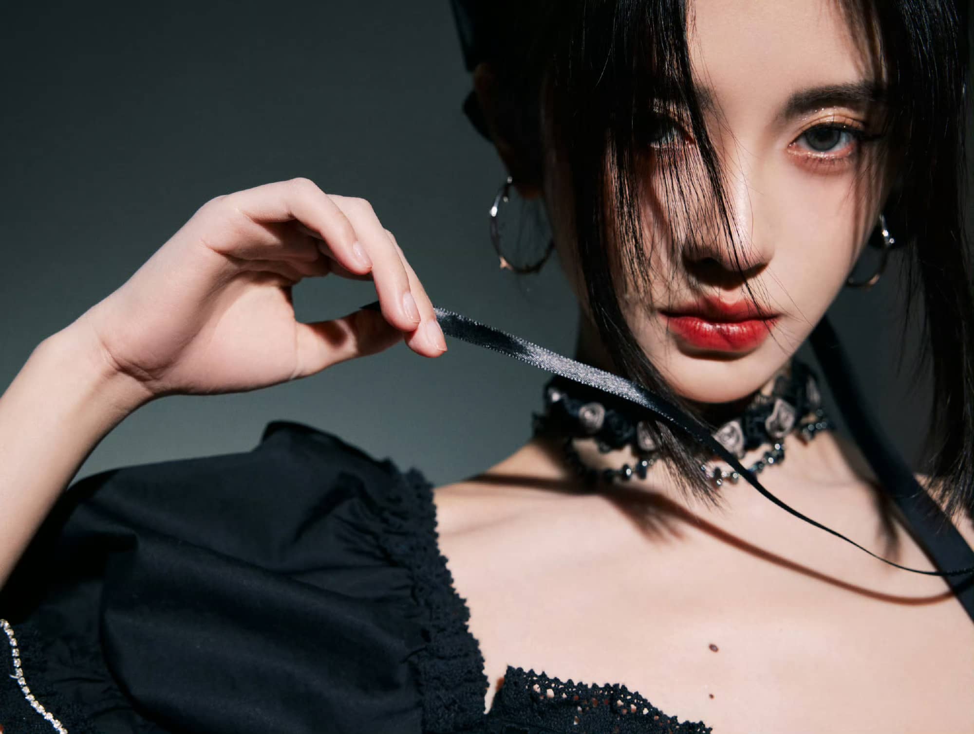 鞠婧祎暗黑风格大片:红唇黑裙,清冷柔美