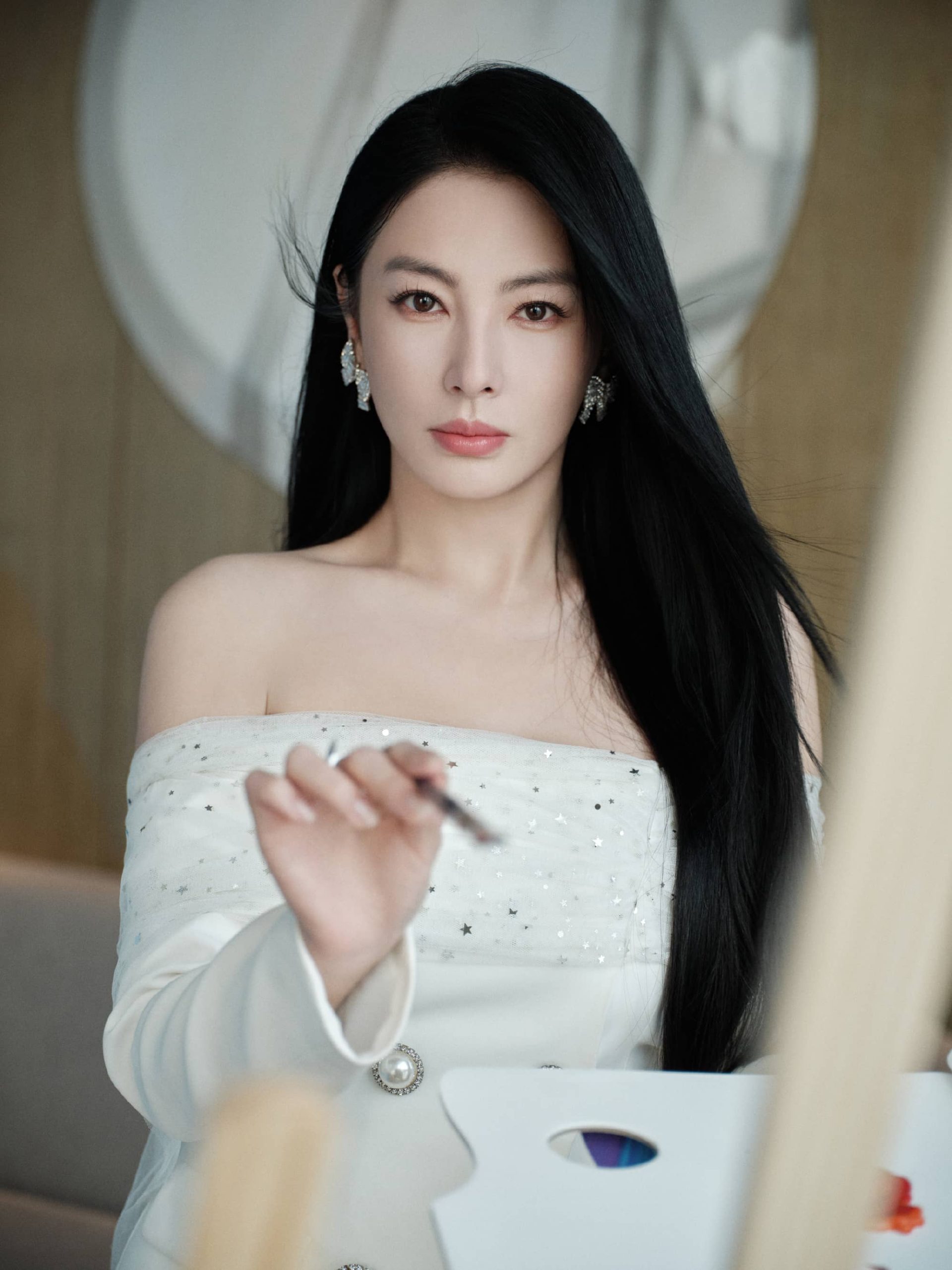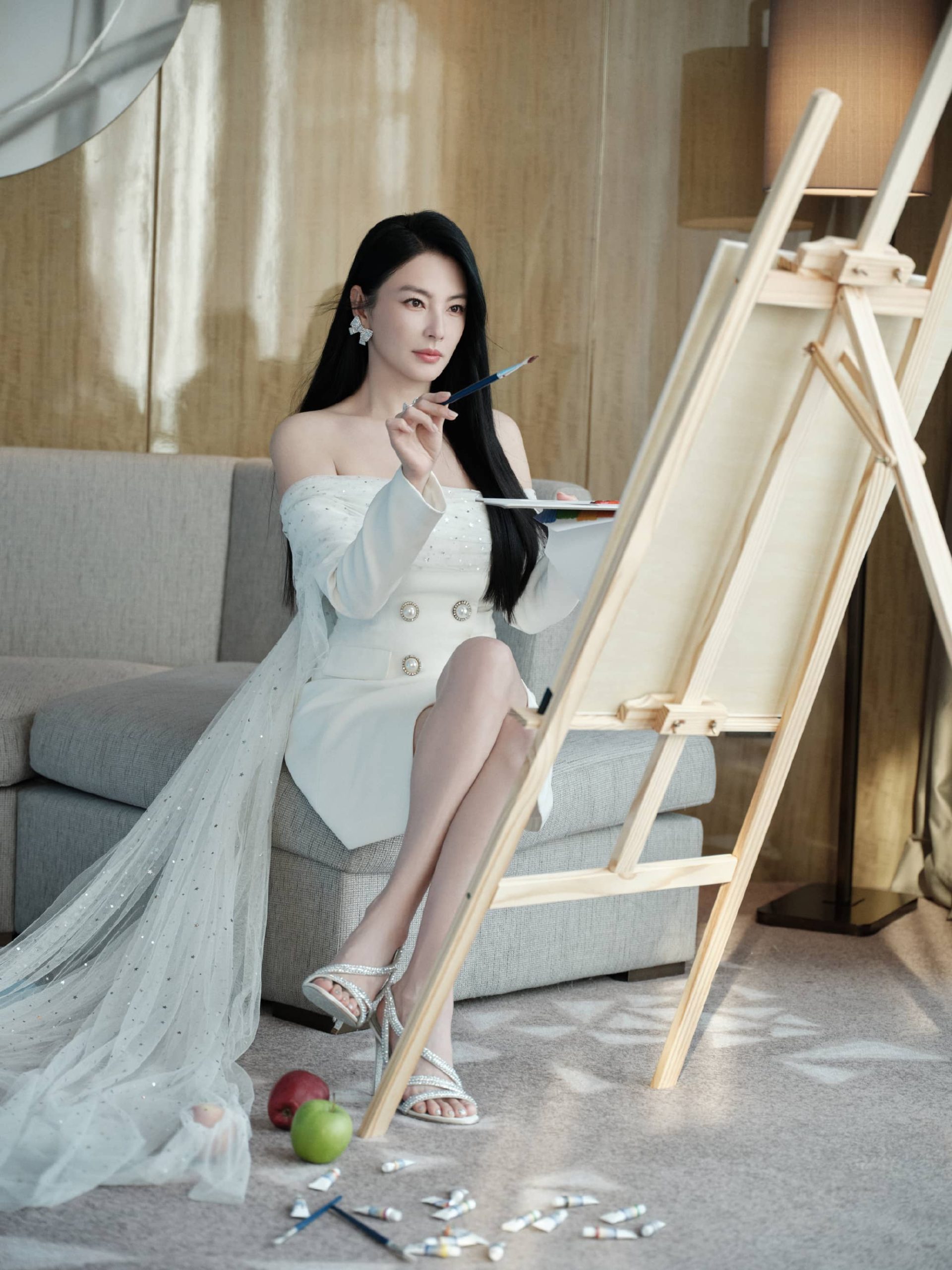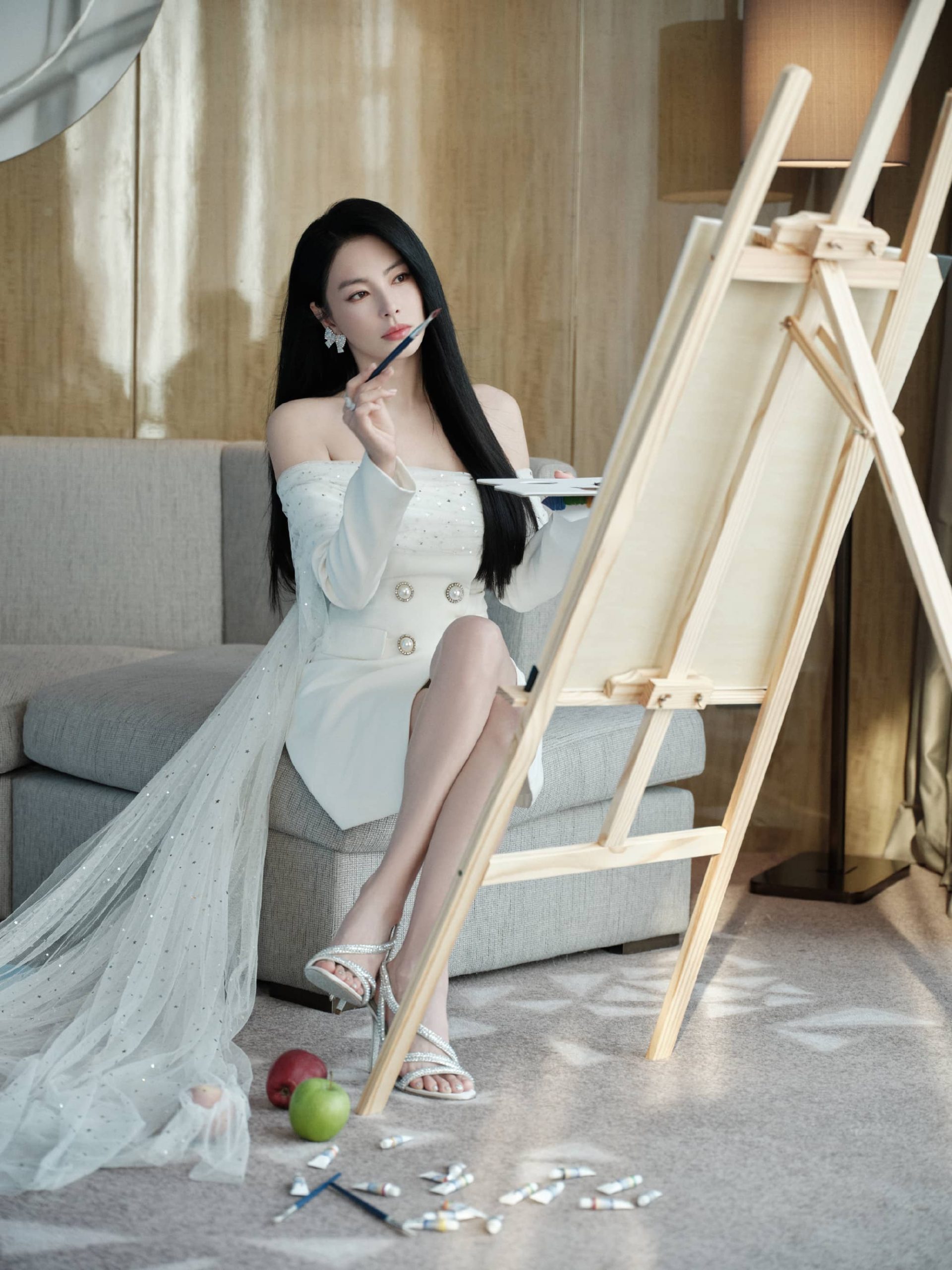 张雨绮抹胸纱裙,化身优雅小画家
