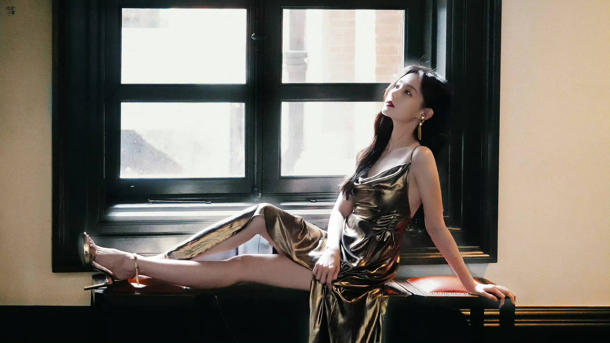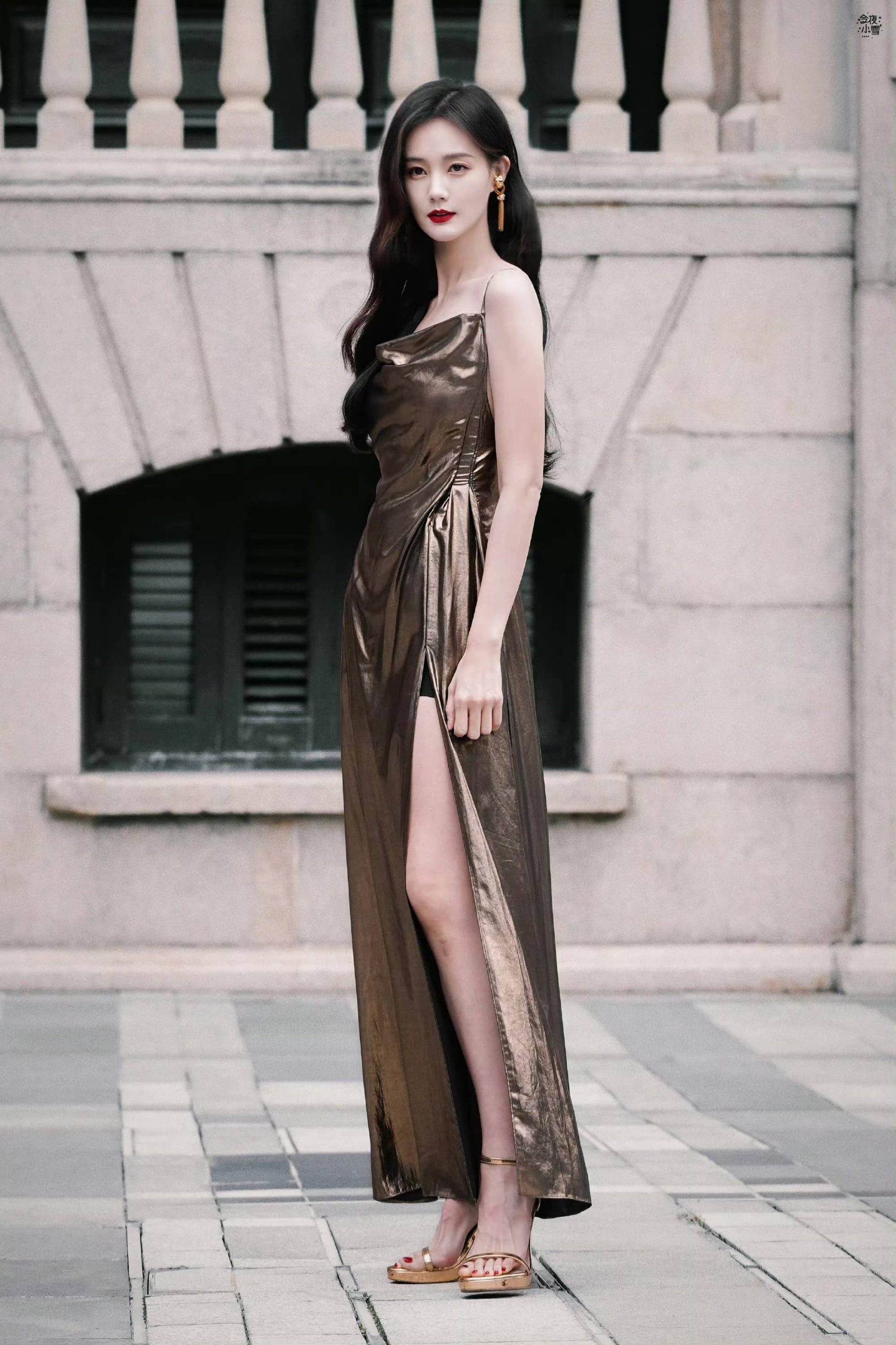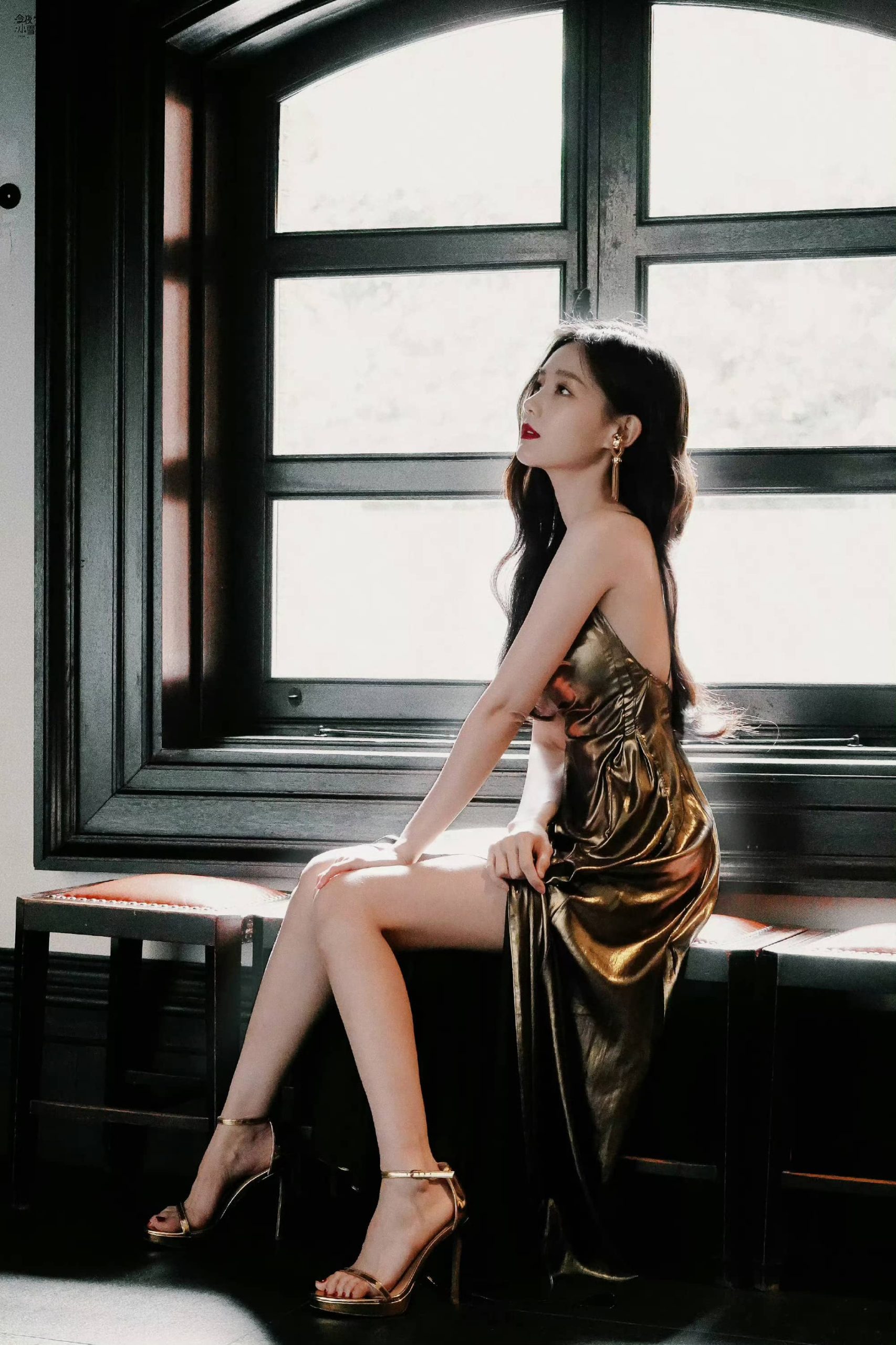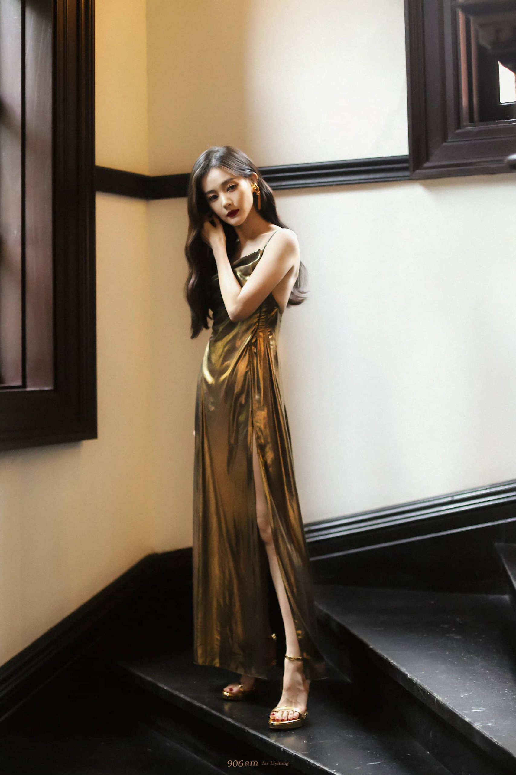李一桐经典穿搭:金色长裙,美腿高跟