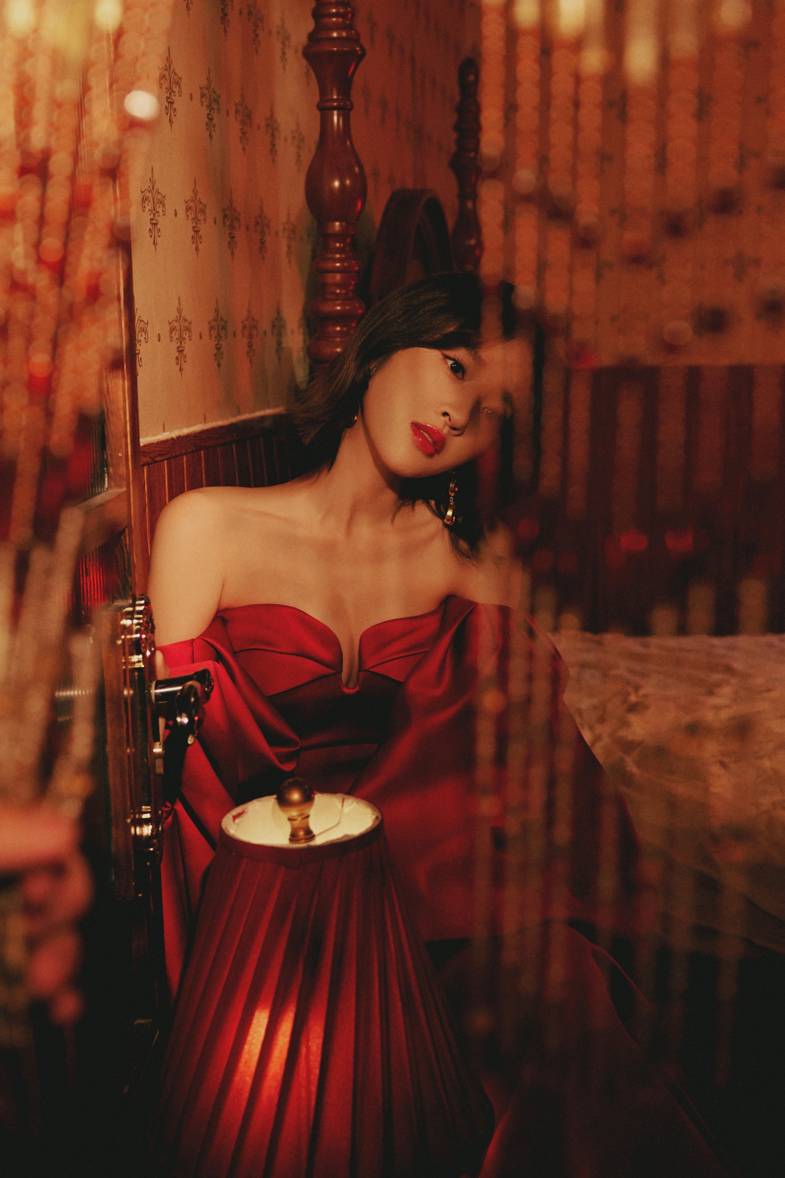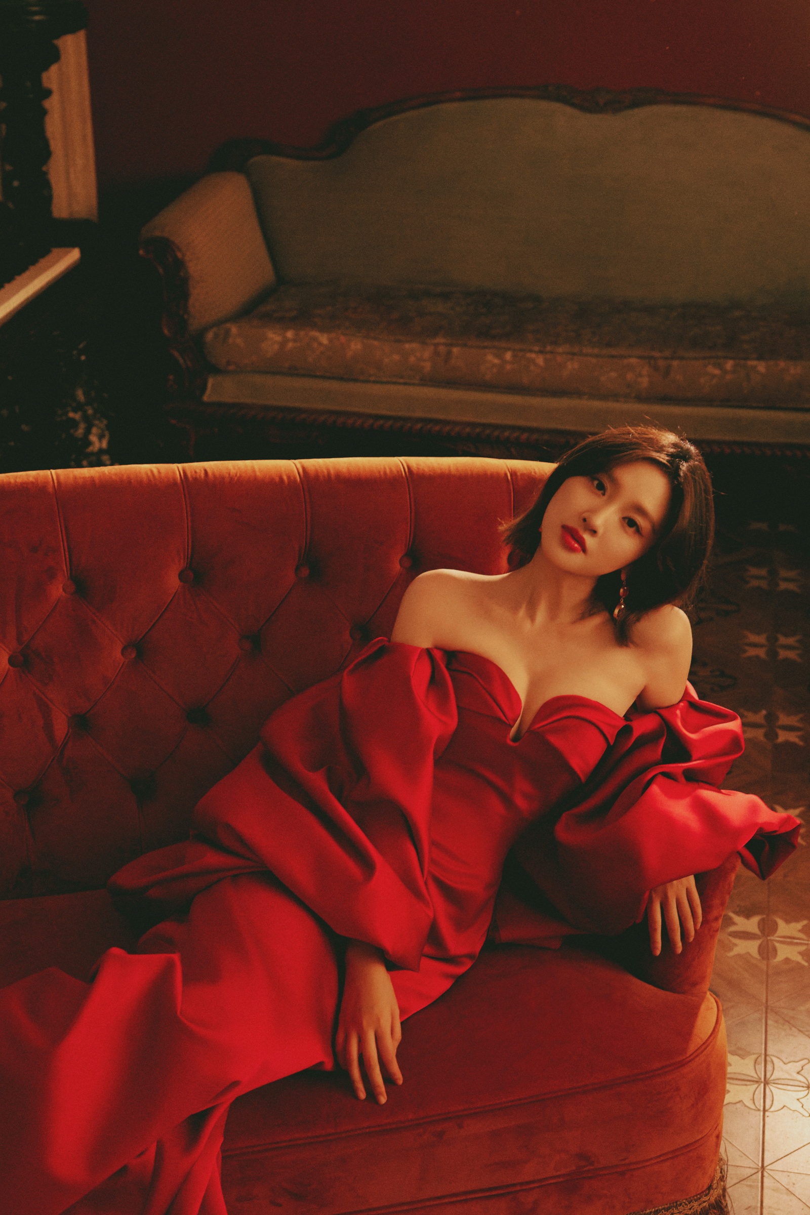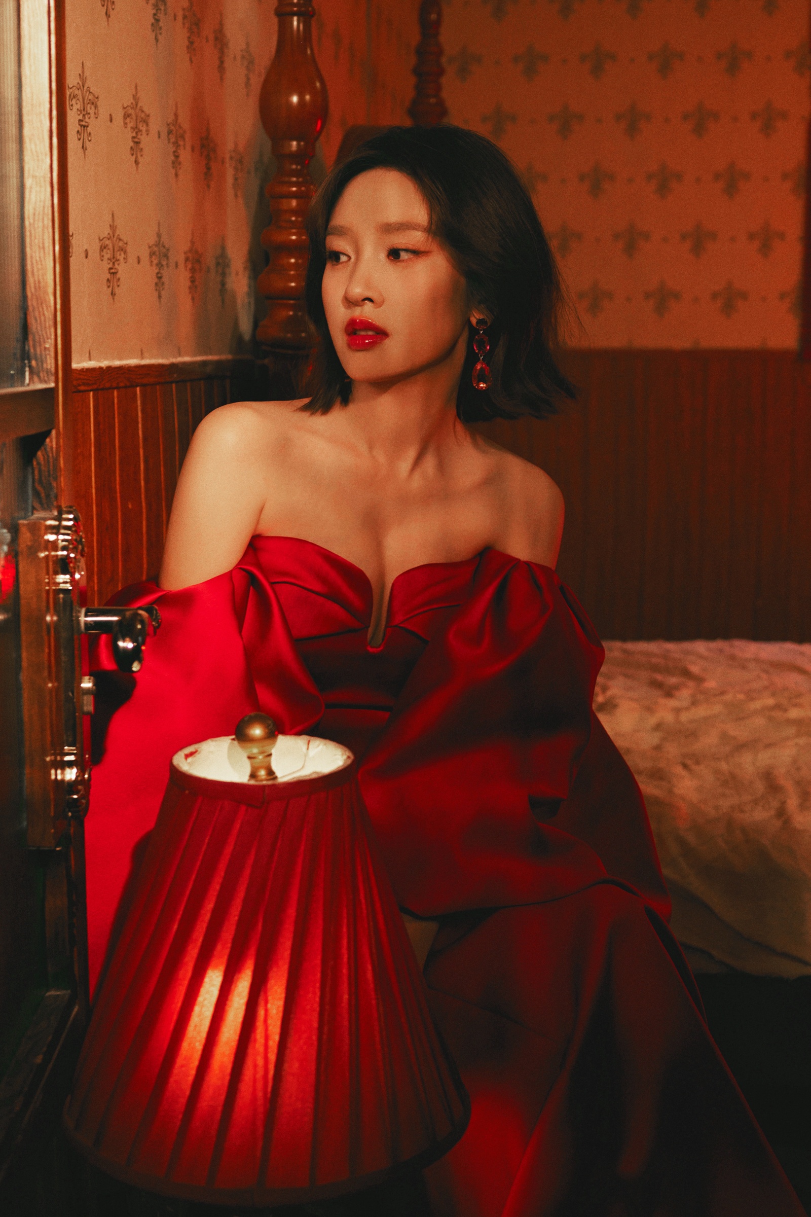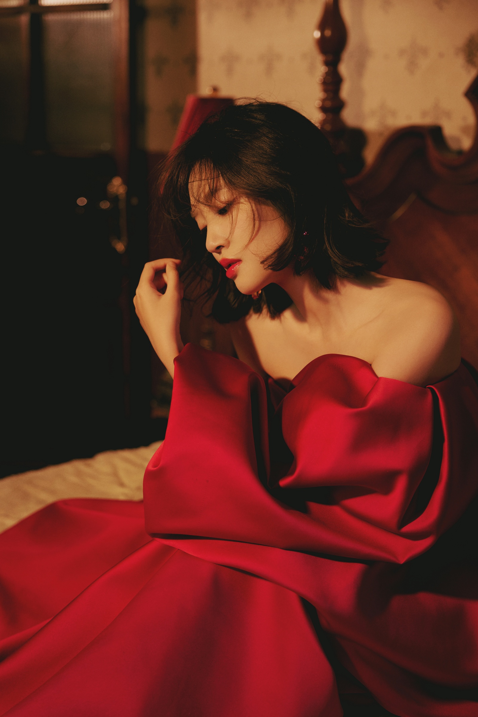 唐艺昕抹胸红裙,勾画光影流韵,让慵懒肆意蔓延