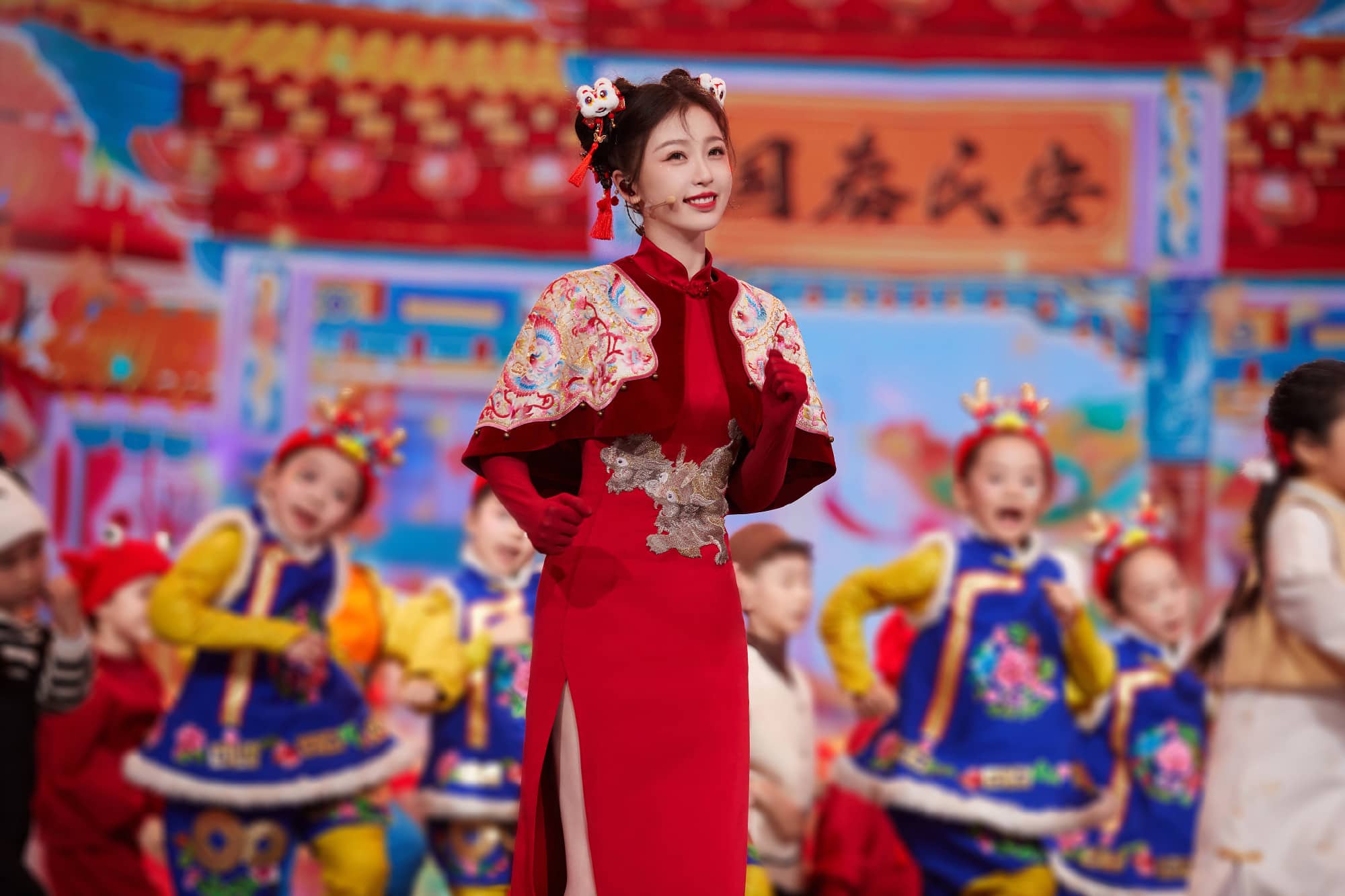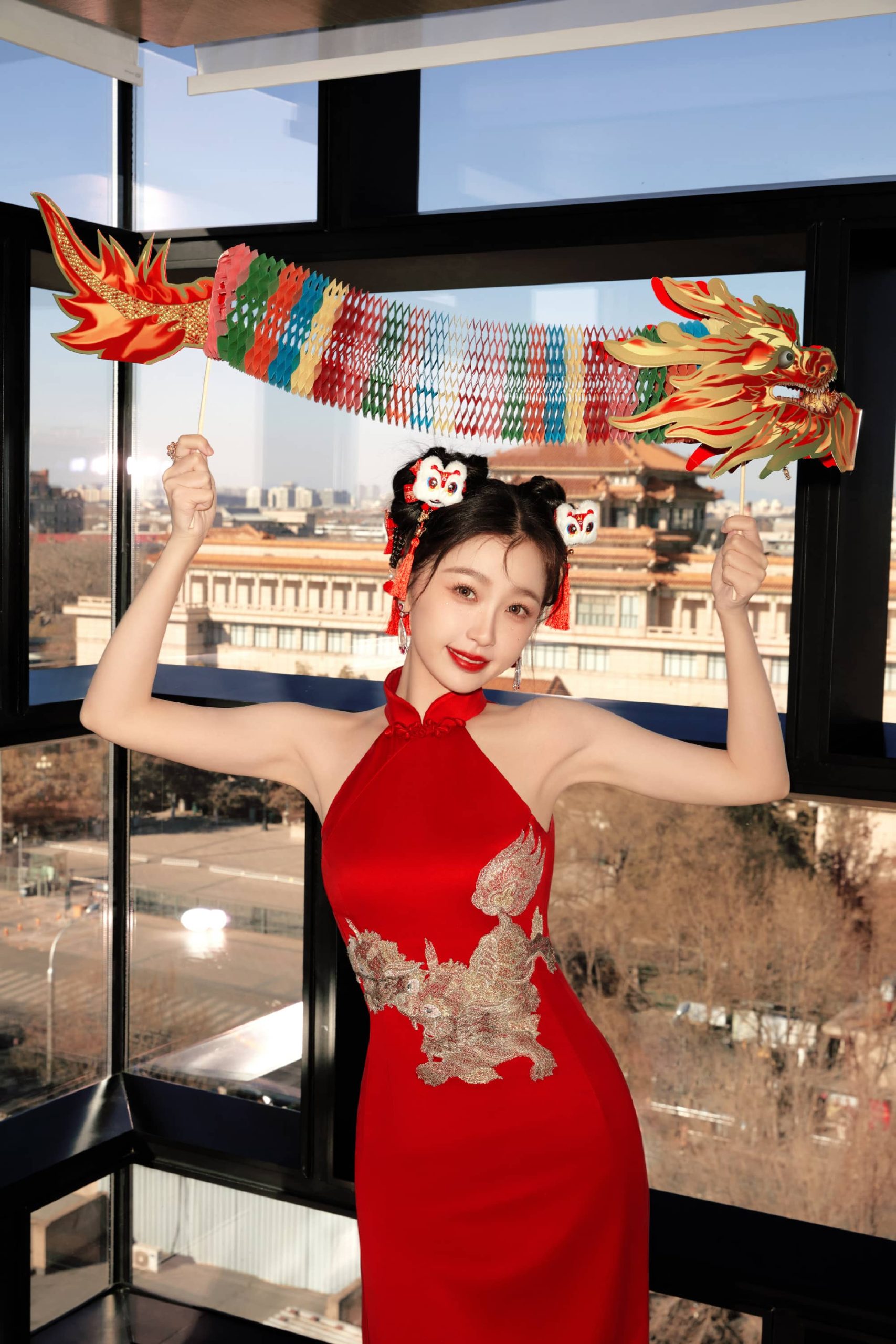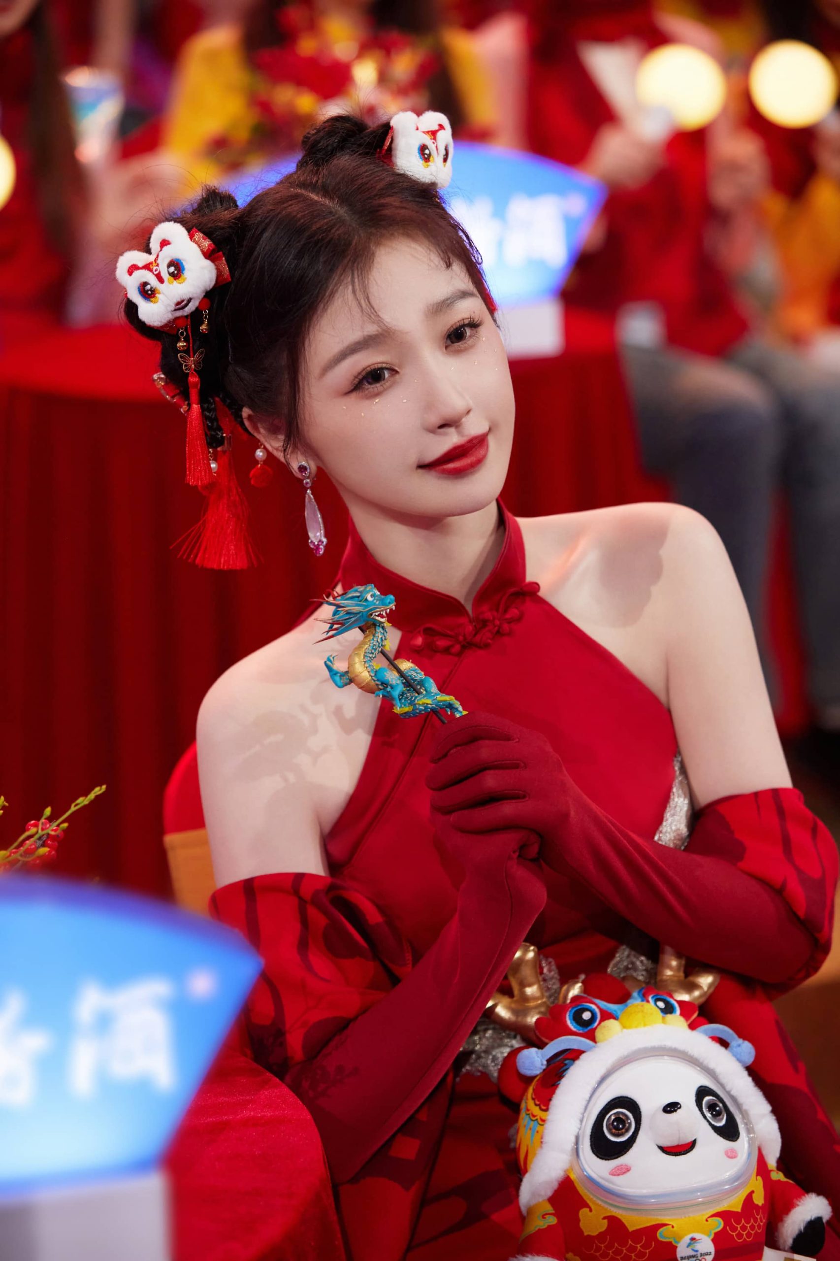 虞书欣红色挂脖裙营业美照